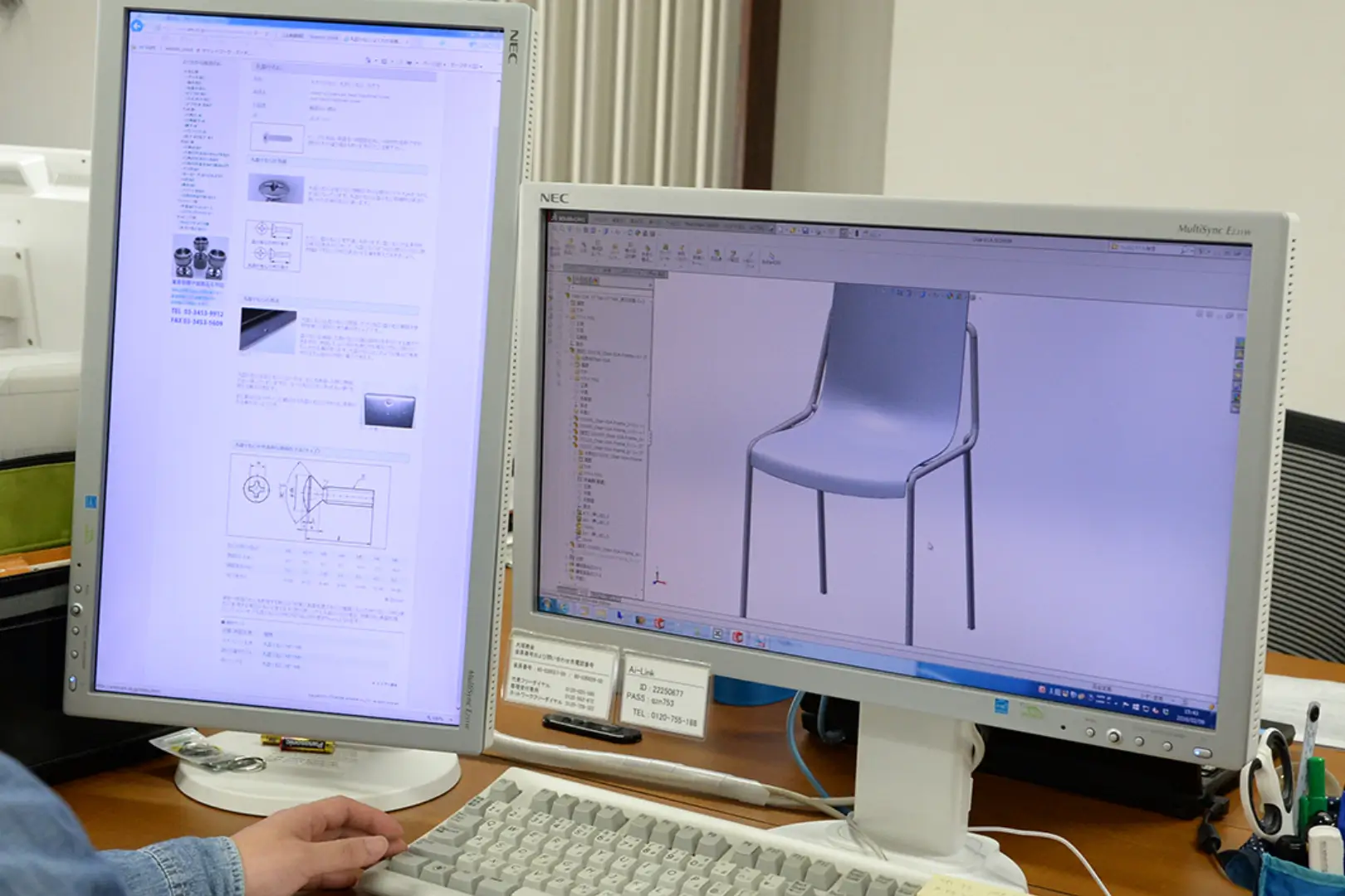設計には、3DCADソフト『SolidWorks』を使用しており、製造現場とのやり取りの効率化を図っています。また、同ソフトを使用した3次元モデリングによる商品提案も行っています。